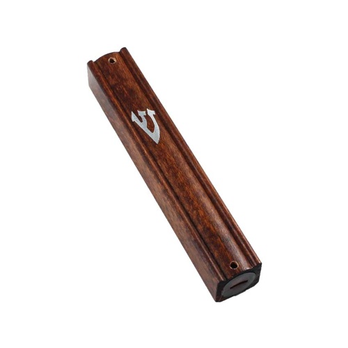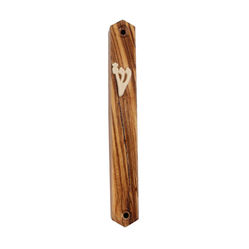 Olive Wood Mezuzah Cover with Appliqued Shin