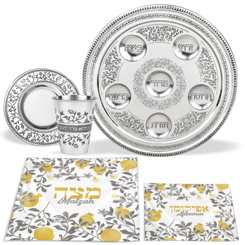 - This unique set features; 7 piece Seder Plate (large plate with 6 dishes for the Passover symbols) Can also be used as a Judaic home decor for year-round without the small dishes. Matzah Plate for Square Matzah in the same matching design. Silk Matzah Cover (with 3 layers for the 3 Matzohs). Afikomen Bag.