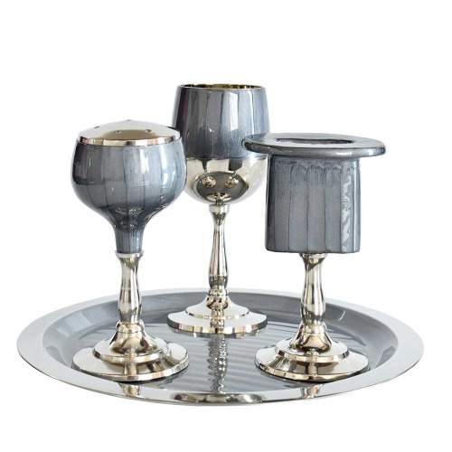 4 Piece Aluminum Havdallah set. a Highly polished Nickel-plated metal body with beautiful permanent decal enhancements.The set includes a full-size Kiddush Cup (6″ Tall), a Havdallah candle holder, Besamim cloves holder & lid, and a matching round tray.
