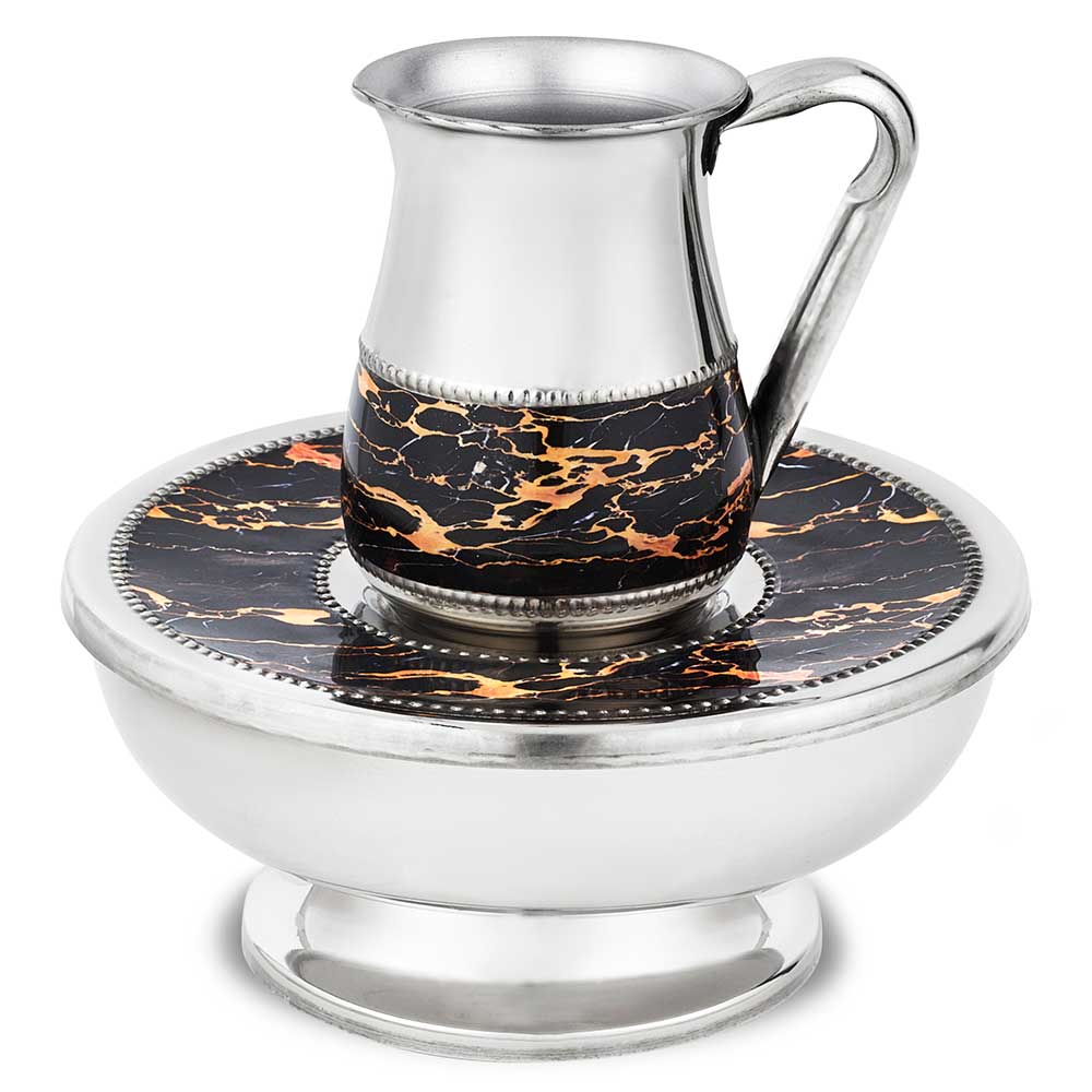Large aluminum Mayim Achronim Set. Decorated with baked in marble decal. 3 piece structure. Enhance your Shabbat and Yom Tov table with a classic Mayim Achronim. Full size 6.25″ high x 6.25″ diameter. Personalization: you will have the option to personalize this item as you proceed to checkout.