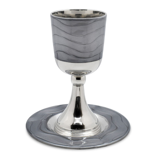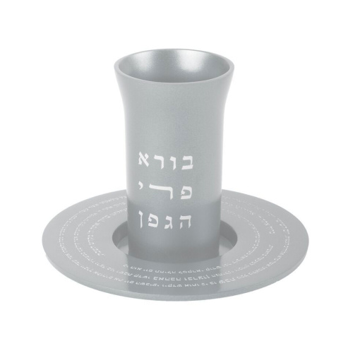 Modern Anodized Kiddush Cup and tray with the words ”Borei Pri Hagafen” written on the cup, and the words of the Friday night kiddush prayer written on the tray. (Turquoise)