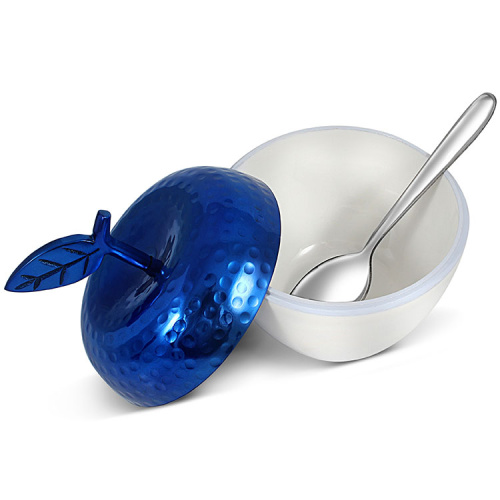Apple Blossom Honey and Apple dish set. A unique Apple and honey theme to enhance your Rosh Hashanah table. Made of polished aluminum. Design by Marcella and staff. Made in New York City.