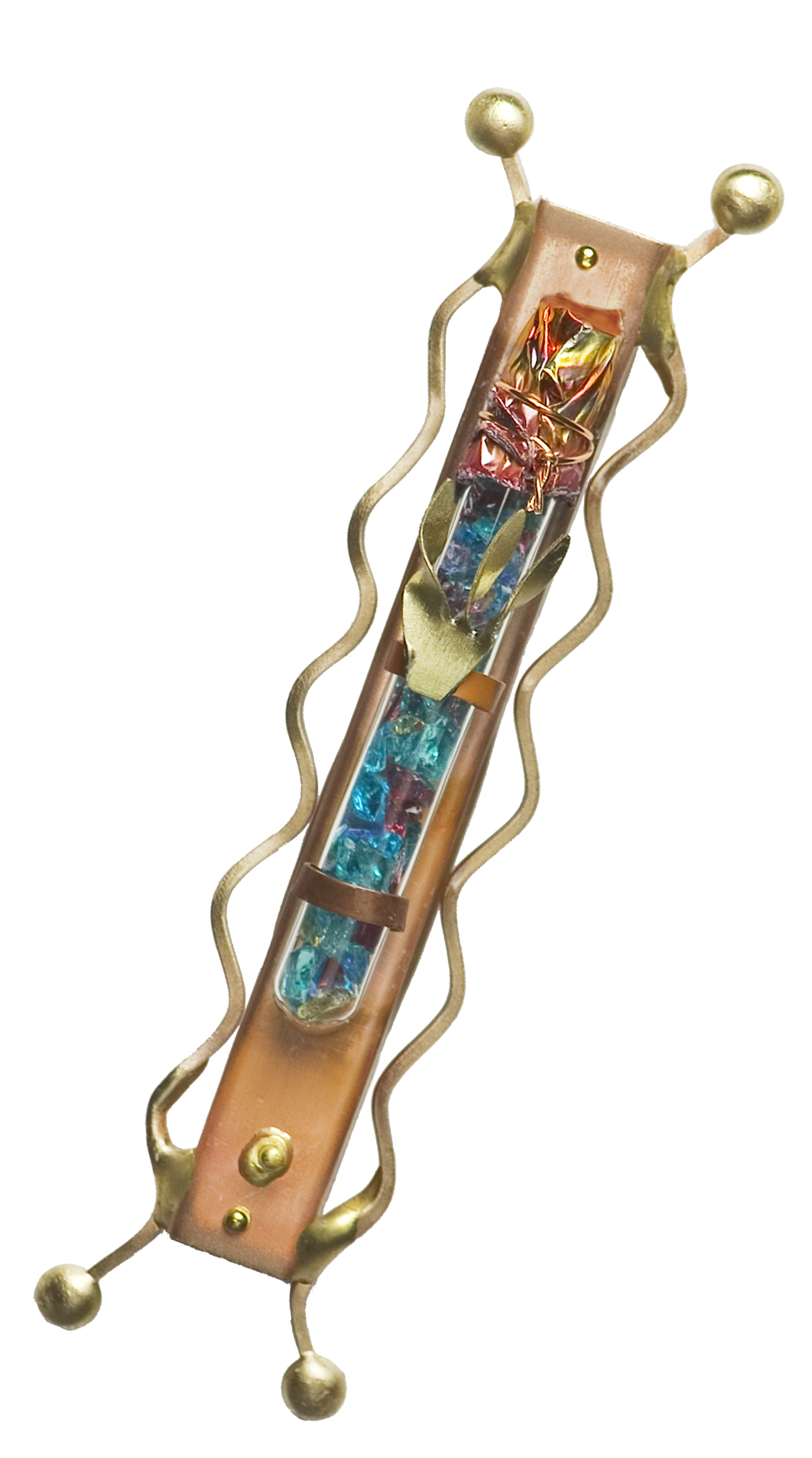 The Gary Rosenthal art collection – Simple squiggled copper and brass wedding mezuzah displays the shards in the front tube and the scroll behind. Artistic Creation of Metal and Glass. Functional yet durable art by Gary Rosenthal. 5.5″x1″