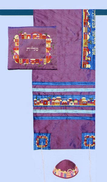 Tallit set by Yair Emanuel – Luxurious Jerusalem theme embroidered on raw silk.