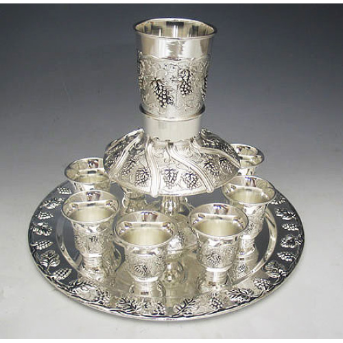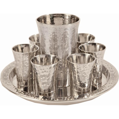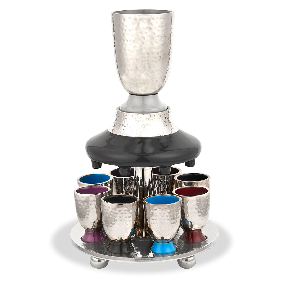 Modern hammered metal Kiddush Fountain withenamel decor.Comes with 1 Goblet and8 cups.