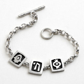 Sterling Silver vignette Bracelet. Hamsa, Chai and Pomegranate charms on a black Oxidized background. Measures 7″. Hand made by Emily Rosenfeld.