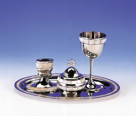 Quietly luxurious, the four pieces of this Havdallah set are crafted from a highly polished, non-tarnishing metal alloy trimmed with hand cut, hand inlaid Mother of Pearl. The gleaming ceremonial wine goblet, the spice box (with pierced lid and a Star of David finial), and the elegant Havdallah candle holder rest securely on the generous tray. The candleholder holds a traditionally shaped braided candle (not included).